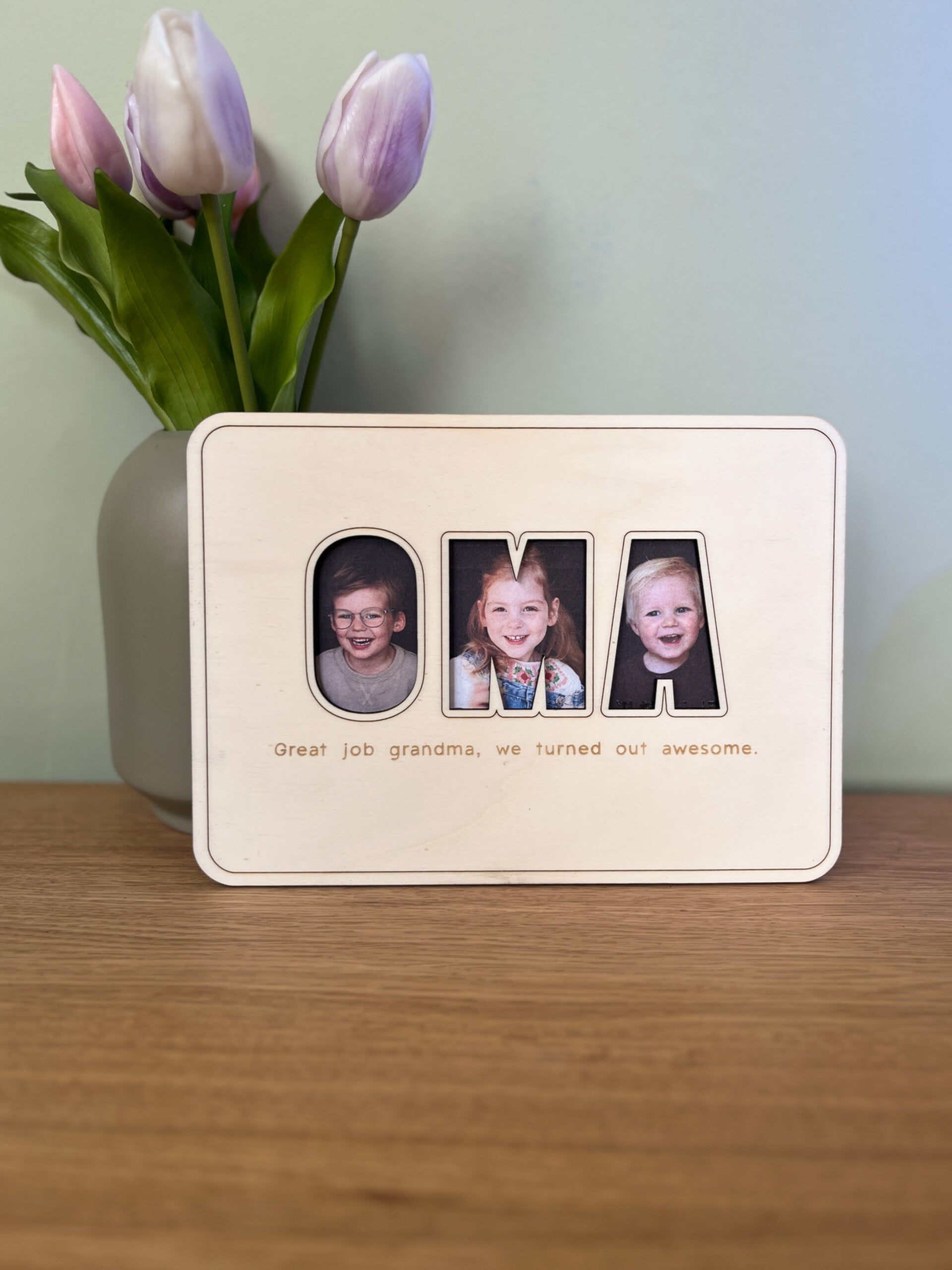 De letters zijn uitgesneden en daarachter kun je foto's plakken. Er wordt een achterkant bij de bordjes geleverd zodat ze netjes zijn afgewerkt.