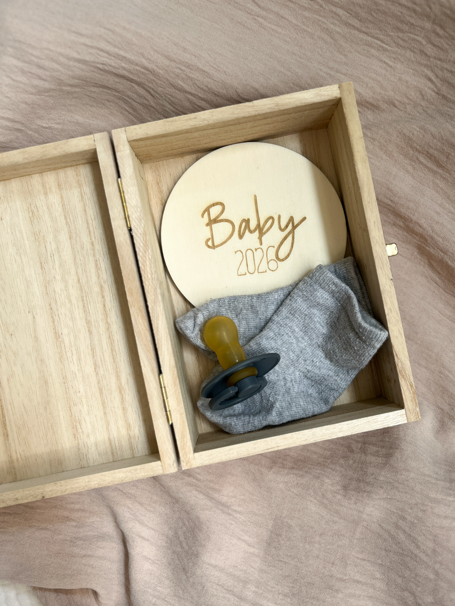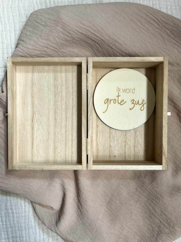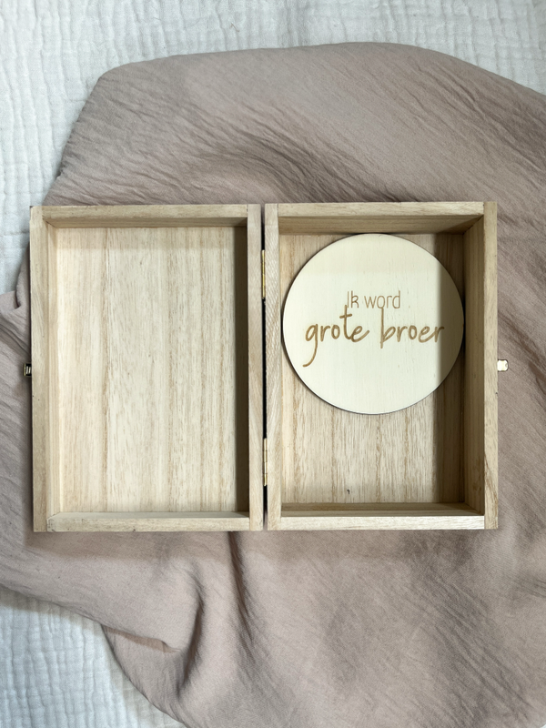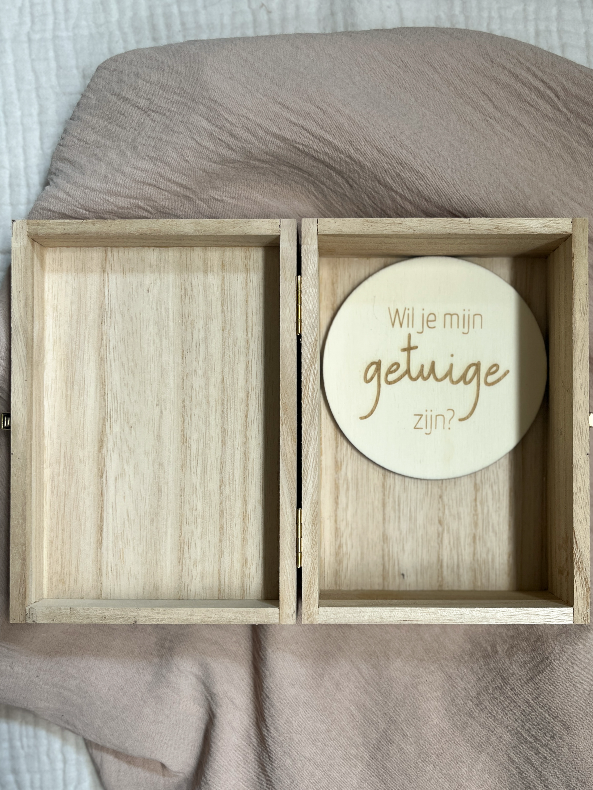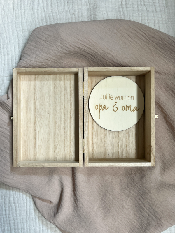 Wil je je zwangerschap bekend maken aan je ouders, of wil je iemand als getuige vragen of zoek je juist een leuk decoratie item voor op een foto? Dan is het houten kistje met leuke boodschap een mooi item. Hiermee kondig jij een mooi moment aan!