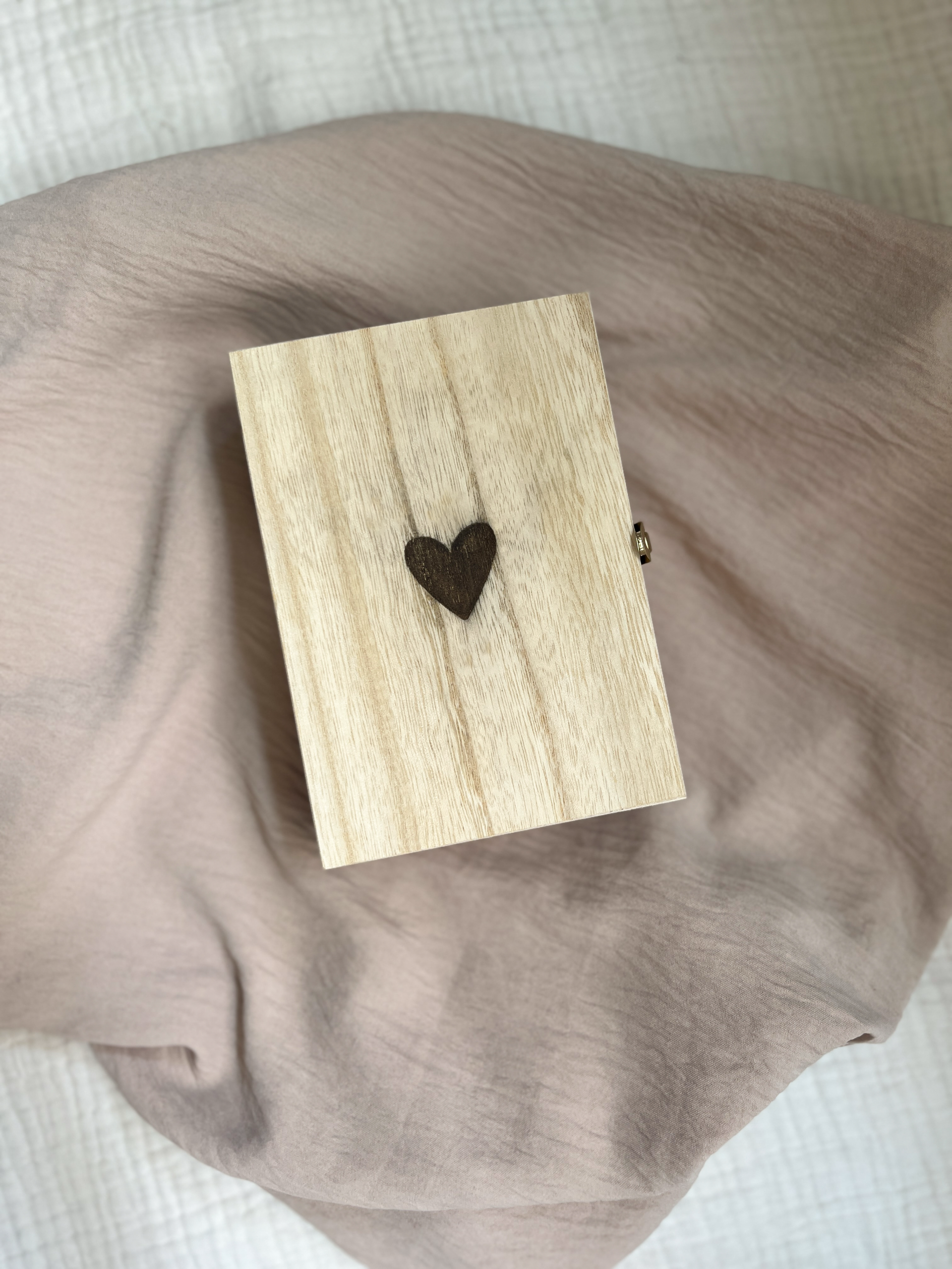 Maak het houten kistje nog persoonlijker en plak aan de linkerkant een foto of een foto van een echo! Met dubbelzijdig tape blijft dit prima zitten.
